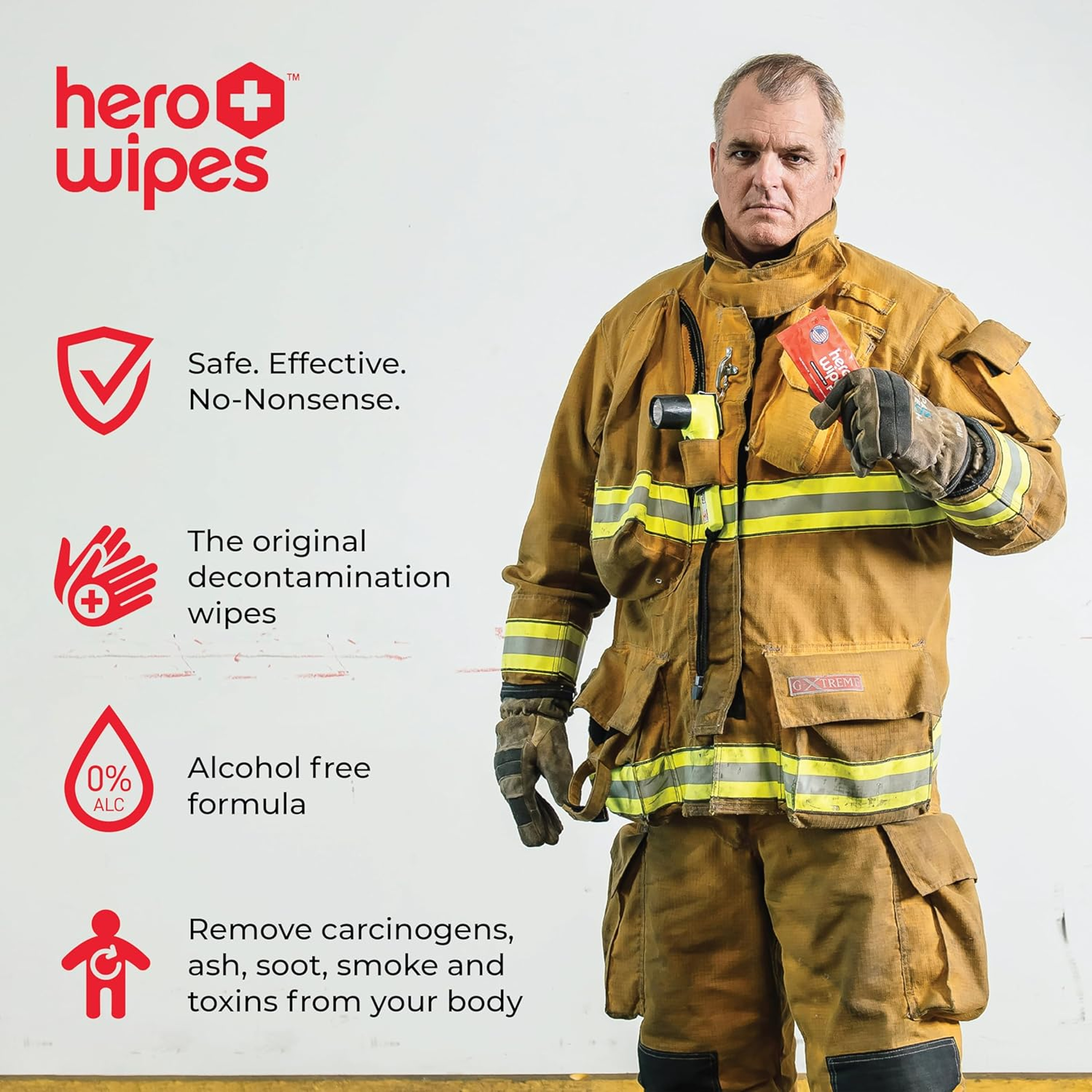 RESPONDER PROTECTION - Hero Wipes remove 98% of toxic and harmful chemicals - carcinogens, ash, soot, and smoke, that may be life-threatening for responders. Additionally, these body wipes can also remove dirt, grime, and dust.