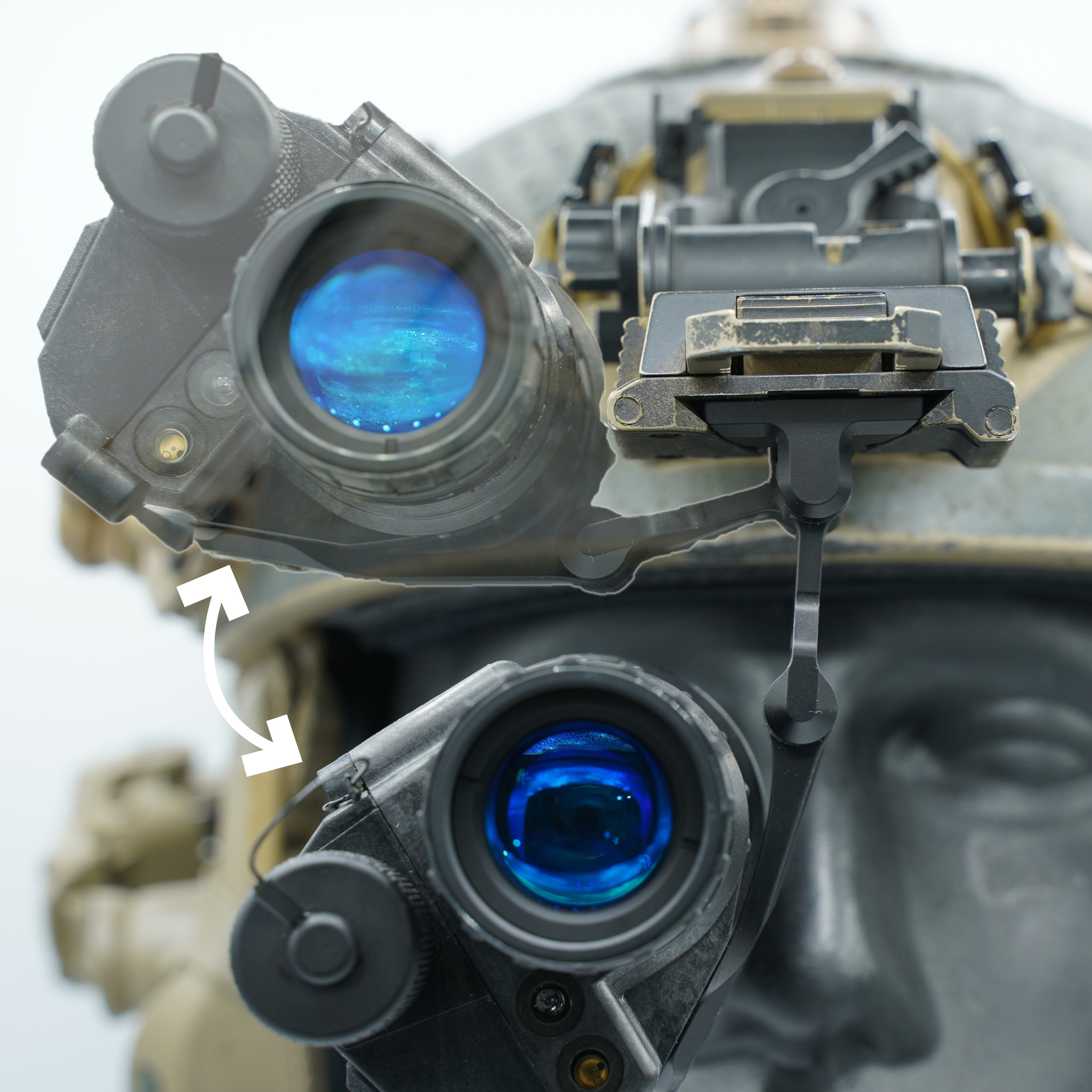 An intuitive, friction-based mechanism allows users to swing their monocular in front of either the left or right eye and perfectly adjust for interpupillary distance, while a slight rearward sweep of the inner arm helps position the monocular eyepiece closer to one's eye and provides greater compatibility for those with larger helmets. A tether point is also featured on the rear to keep the entire system secure. Attach a monocular, snap the complete assembly into a dovetail-style helmet mount like the Wilcox® G24, and enjoy. Introducing the new industry standard in night vision monocular mounting.
