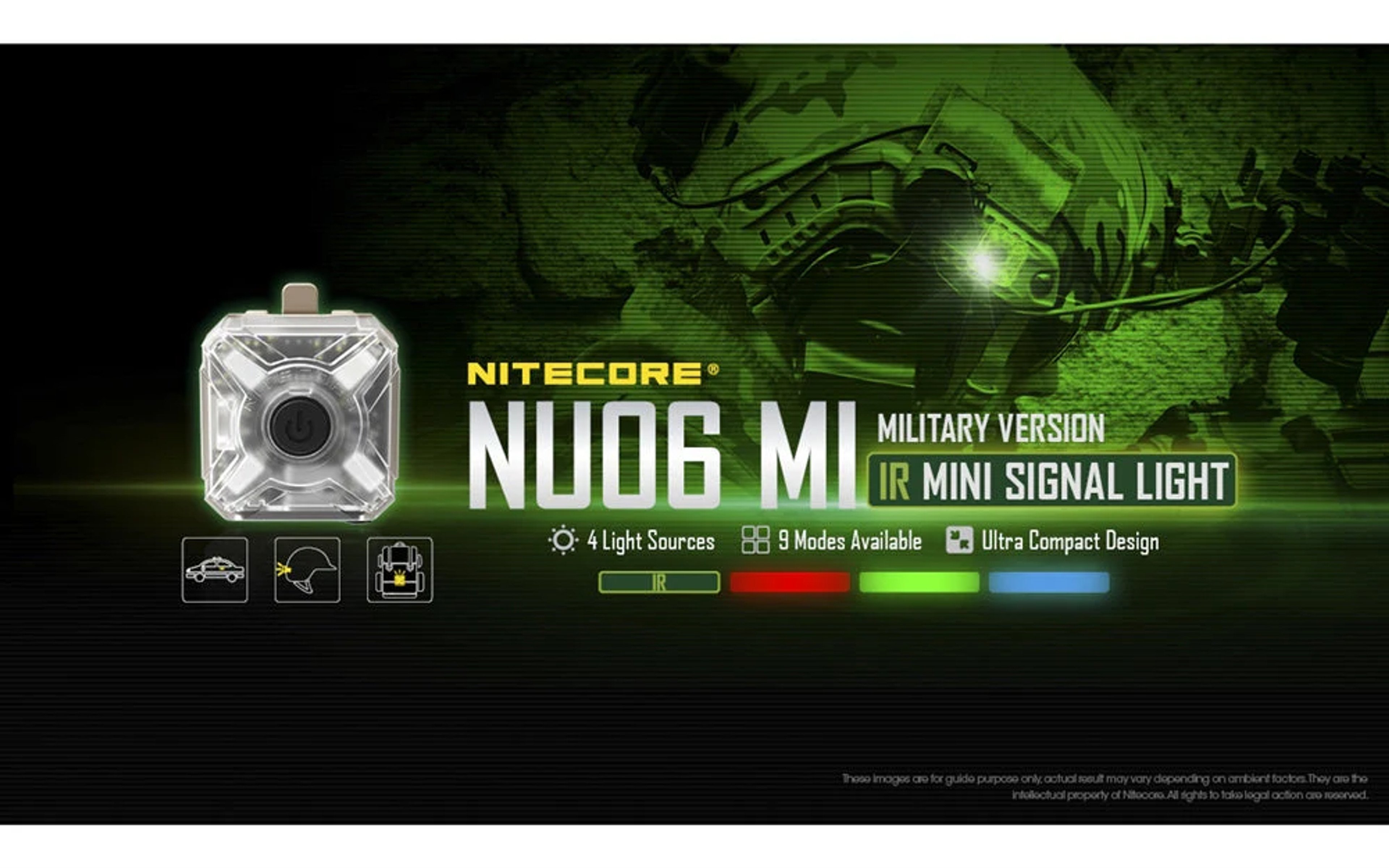 The NU06 MI is a mini LED safety and signal light specifically designed for outdoor activities and law enforcement personnel. It comes with four LEDs in a compact X formation: IR, blue, green and red. Each LED can be activated on a constant-on, a flashing mode, and a setting allows for red and blue LEO flashing as a warning signal. The IR LED allows for signaling and identification with special night vision equipment and gear.