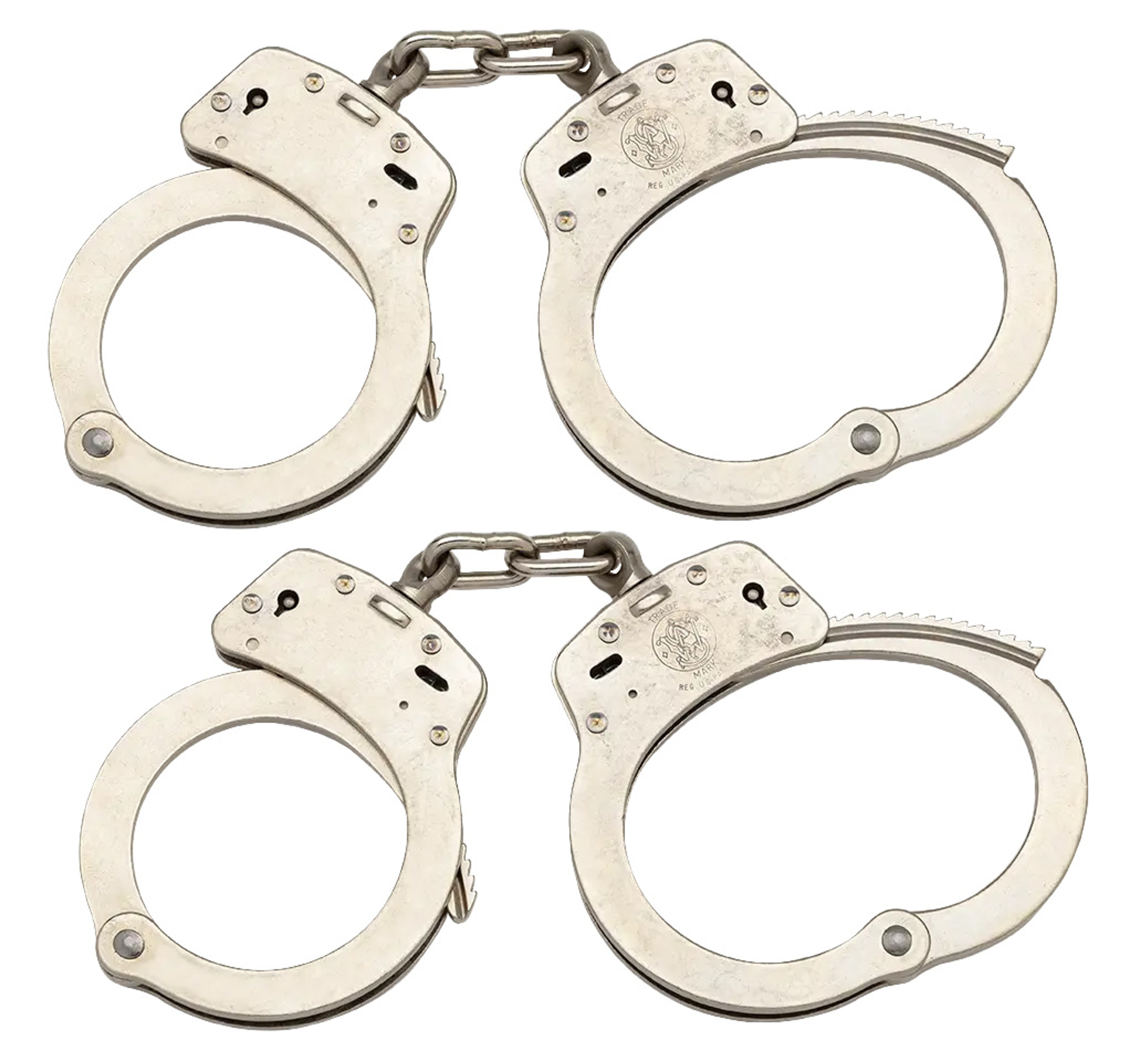 Smith & Wesson Model 100-1 Handcuffs are constructed of nickel plated carbon steel. Carbon steel provides strength and nickel plating creates a corrosion resistant surface. The satin nickel finish is not shiny and makes the handcuffs appear cloudy. They do this to ensure the handcuffs are both non-reflective and easy to grip. These handcuffs use the slot lock double locking mechanism, to double lock these handcuffs insert the double lock pin on your handcuff key into the double lock slot and pull down towards the keyhole. Double locking handcuffs makes them harder to shim, it also prevents the handcuffs from being further tightened. When double locked, handcuffs cannot be tightened or picked. Includes two handcuff keys, Smith & Wesson's lifetime warranty and instructions.
